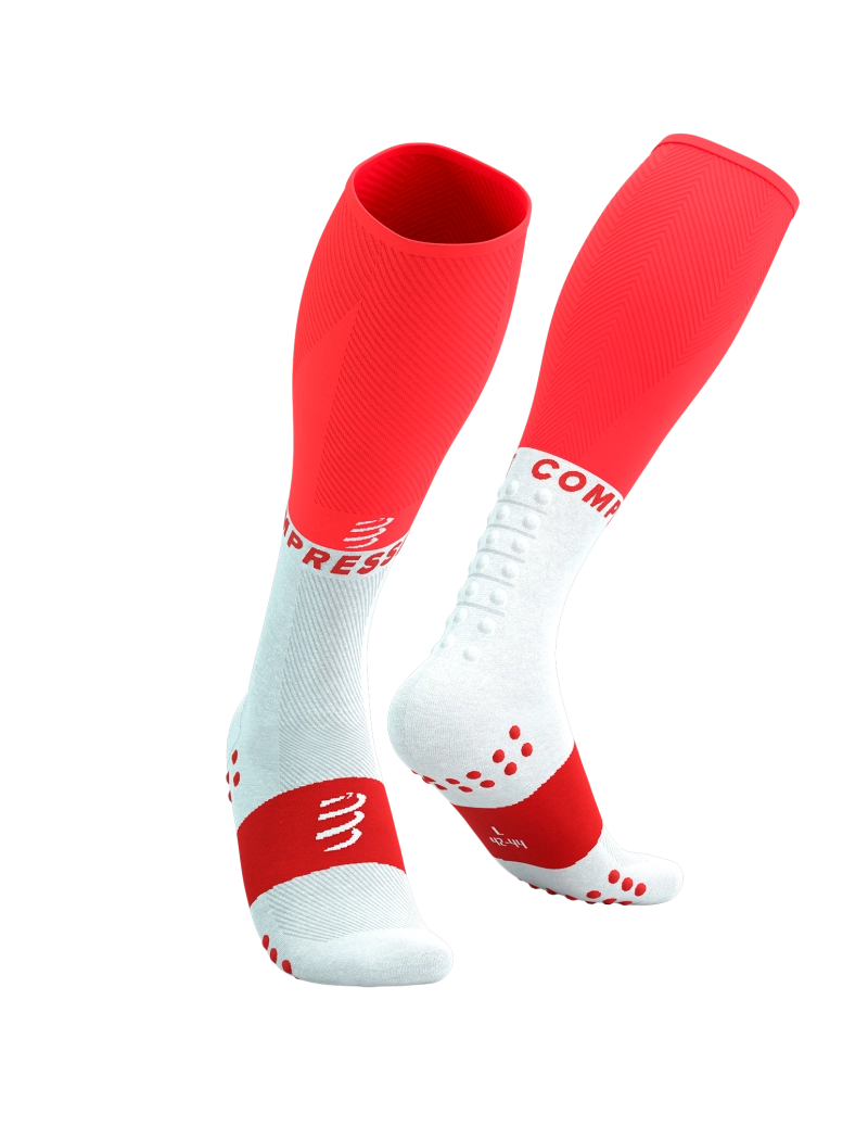La nouvelle génération de Full Socks Oxygen hisse le soutien musculaire et la ventilation à un niveau supérieur : vous pouvez compter sur un allié redoutable pour les courses rapides dans les contextes les plus chauds. Ces chaussettes de compression pour la course à pied et les sports d`endurance sont légères comme une plume, offrant une sensation de seconde peau inégalée et un confort exceptional grâce à un tissu en maillage ultra-doux. Pour notre chaussette la plus légère de la gamme Compressport, l`aération et la respirabilité sont primordiales : les bandes de ventilation entrelacées en zigzag partent de la base du mollet, puis leur hauteur augmente progressivement autour du muscle, pour une dilatation et une respiration naturelle lors des efforts intenses. Cette ventilation graduée assure une thermorégulation de très haut niveau pour vous accompagner lors de vos plus grandes courses. Les fibres incroyablement fines conservent toutes les propriétés et avantages de la compression, pour un soutien et une protection maximale du pied et des mollets, tout en limitant les chocs et les vibrations dans les muscles et les tendons. L`oxygénation des muscles est améliorée jusqu`à 10 %, ce qui retarde l`apparition de la fatigue et augmente les performances. Les 3D.Dots soigneusement placés autour du pied offrent une meilleure adhérence dans la chaussure et remontent jusqu`au tendon d`Achille pour stimuler la circulation sanguine et absorber les chocs. La structure et le volume des Dots sont réduits par rapport à d`autres modèles de chaussettes pour obtenir une légèreté générale, mais leur efficacité est conservée. Enfin, nos nouveaux logos tricotés durables garantissent que la signature de Compressport restera en place dans les conditions les plus difficiles - tout comme vous. Que vous soyez un marathonien ou un coureur de fond, ne faites aucun compromis sur le confort et les performances avec ces chaussettes de compression ultralégères et rafraîchissantes !