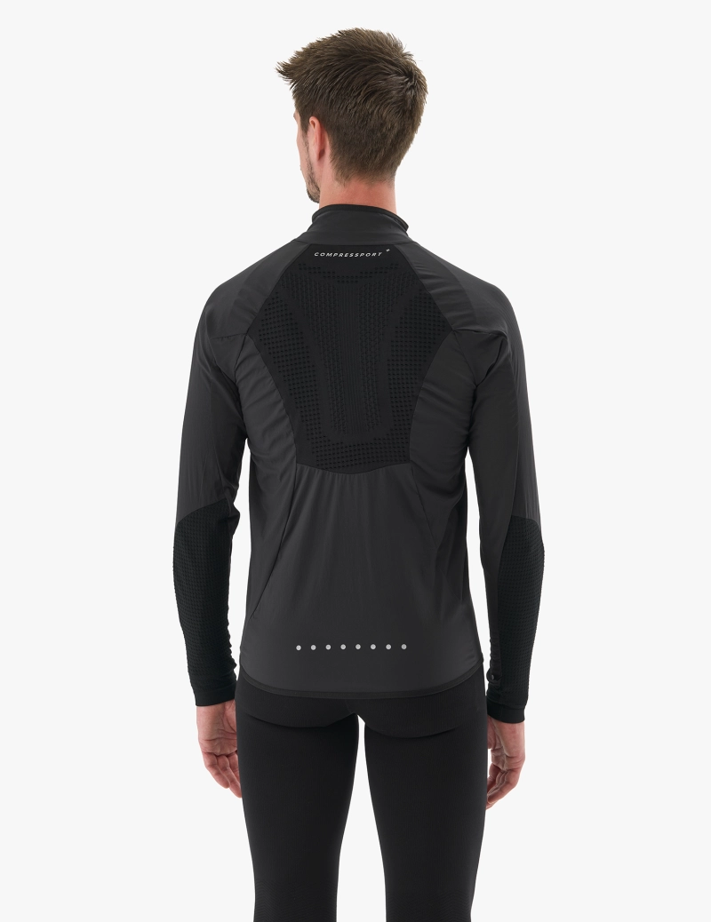 Lorsque votre programme implique de sortir alors que le vent souffle, la veste coupe-vent Hurricane toutes saisons est l’armure dont vous avez besoin pour aller au bout. Développée spécifiquement pour apporter une protection exceptionnelle contre le vent, cette veste poids plume intègre les technologies Compressport emblématiques dans seulement 100 g de tissu. Sur le devant, le matériau Tafta offre une protection ultime contre les vents forts pour vous garder au chaud lorsque les éléments sont contre vous. Le matériau du dos et des manches est doté de notre technologie On/Off emblématique : les alvéoles intelligentes s’ouvrent pour une respirabilité optimale afin de garder le baselayer au chaud et au sec. La coupe est parfaitement ajustée pour éviter tout battement gênant. Comme une seconde peau, vous oublierez que vous le portez. Grâce à son effet stretch « 4-way », cette veste vous confère une totale liberté de mouvement et s’étire facilement sur un sac de trail. Ouvrez la fermeture à glissière autobloquante sur toute la longueur pour plus de respirabilité lorsque le soleil se lève. Une poche de poitrine pratique vous permet de garder l’essentiel à portée de main. Réversible, cette poche peut accueillir la veste une fois pliée. Glissez-la rapidement dans une poche ou une ceinture Freebelt lorsque le vent se calme. Les manches longues et le col haut offrent une protection et une chaleur supplémentaires, tout comme la conception plus longue à l’arrière. Les détails réfléchissants sont indispensables pour rester visible et en sécurité lorsque la luminosité est faible. La veste comporte donc des logos réfléchissants à l’avant et à l’arrière, des points à la base du dos et des bandes autour des poignets. Très doux au toucher, vous n’entendrez aucun bruissement quand vous vous déplacerez. Conçue avant tout pour contrer le vent, sa conception légèrement déperlante vous permet de traverser les averses inattendues. Parfaite pour le trail, le cyclisme, le ski de fond ou toute autre activité de plein air.