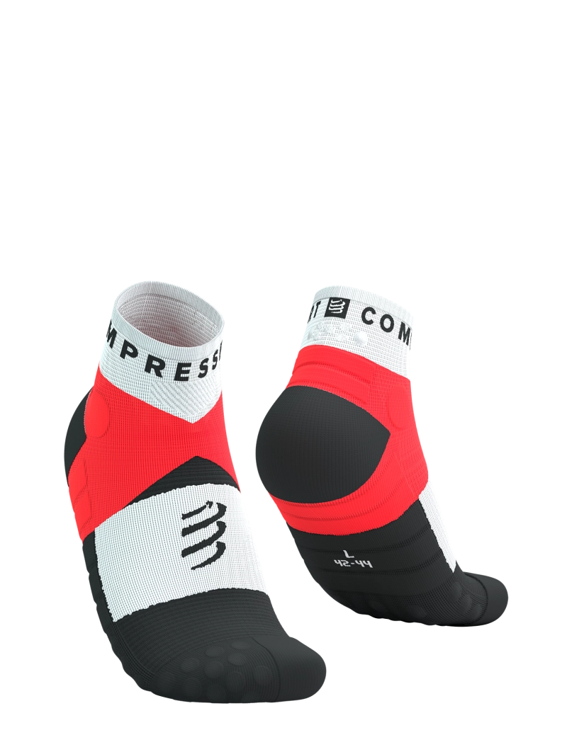 Lorsque le sentier exige de la stabilité, de l’amorti et une fraîcheur bienvenue, nous répondons avec nos chaussettes Ultra Trail Low Cut Sock : les chaussettes de performance idéales pour les coureurs de trail qui ont besoin de confort et de soutien face aux difficultés du parcours. Dotées des mêmes caractéristiques haute technologie que leur équivalent « crew-cut », ces chaussettes de running basses ont été renforcées sur la zone des orteils en tissu éponge pour vous protéger des plaies aux orteils et aux ongles lors des descentes techniques. Les bandes en tissu éponge plus épaisses sous le pied et à la base du tendon d’Achille absorbent les chocs sur le terrain et réduisent la pression de vos chaussures de running. Le maintien à 360° de la voûte plantaire offre une compression ciblée pour améliorer la circulation sanguine et repousser la fatigue, tout en empêchant le tissu de se tordre et de causer des ampoules. Le nouvel X-strap a spécifiquement été développé pour améliorer la stabilité sur terrain rocheux, enveloppant fermement votre cheville pour un soutien sans faille. Sa compression légère associée au soutien de la voûte plantaire permet d’améliorer votre performance lorsque les heures s’accumulent. Les points techniques sous le pied augmentent le flux d’air et l’adhérence dans la chaussure tandis que les gros ronds en tissu éponge au niveau des malléoles vous protègent lorsque vos pieds décollent du sol ou que vous courez sur des pierres dans les sections techniques. Grâce au maillage sur le dessus du pied qui évacue la transpiration, les chaussettes Ultra Trail Low Cut Sock sont idéales par temps chaud ou en combinaison avec des manchons pour mollets Compressport pour vous offrir tout le soutien dont vous avez besoin lors des trails les plus exigeants.